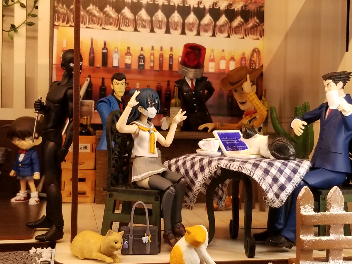 オクタショーケース3段目 メイン2のジオラマ風カフェ? ドールハウスはカントリーウッドガーデン 一般人に見えるリトルアーモリーとバイオニックは最高やで あとルパンも便利ね