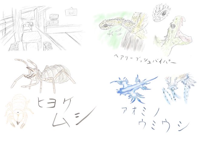 #今月描いた絵を晒そう 広縁、ヘアリーブッシュバイパー、ヒヨケムシ、アオミノウミウシ まあ殆どは写真見ながらラフ描いてそれっぽい色塗って投稿前に別の資料を見つつ手直ししてって感じ。 しばらくはこんな感じが続きそうね