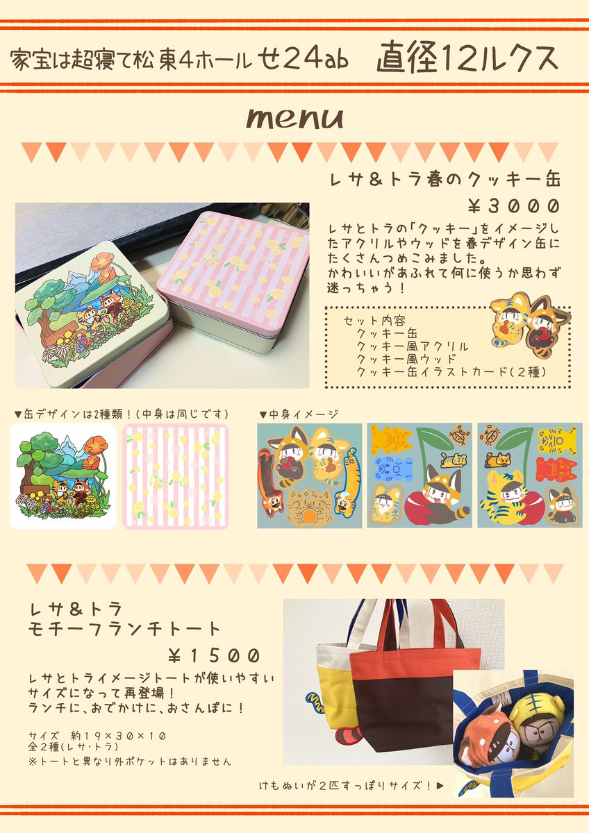 5/3超家宝お品書きです!! ずいこー(@zui_koh)さんとの合作、春クッキー缶とランチトートを持っていきます🍪 東4せ24abにてお待ちしております〜 詳細は後ほどツリーに繋げます🌲