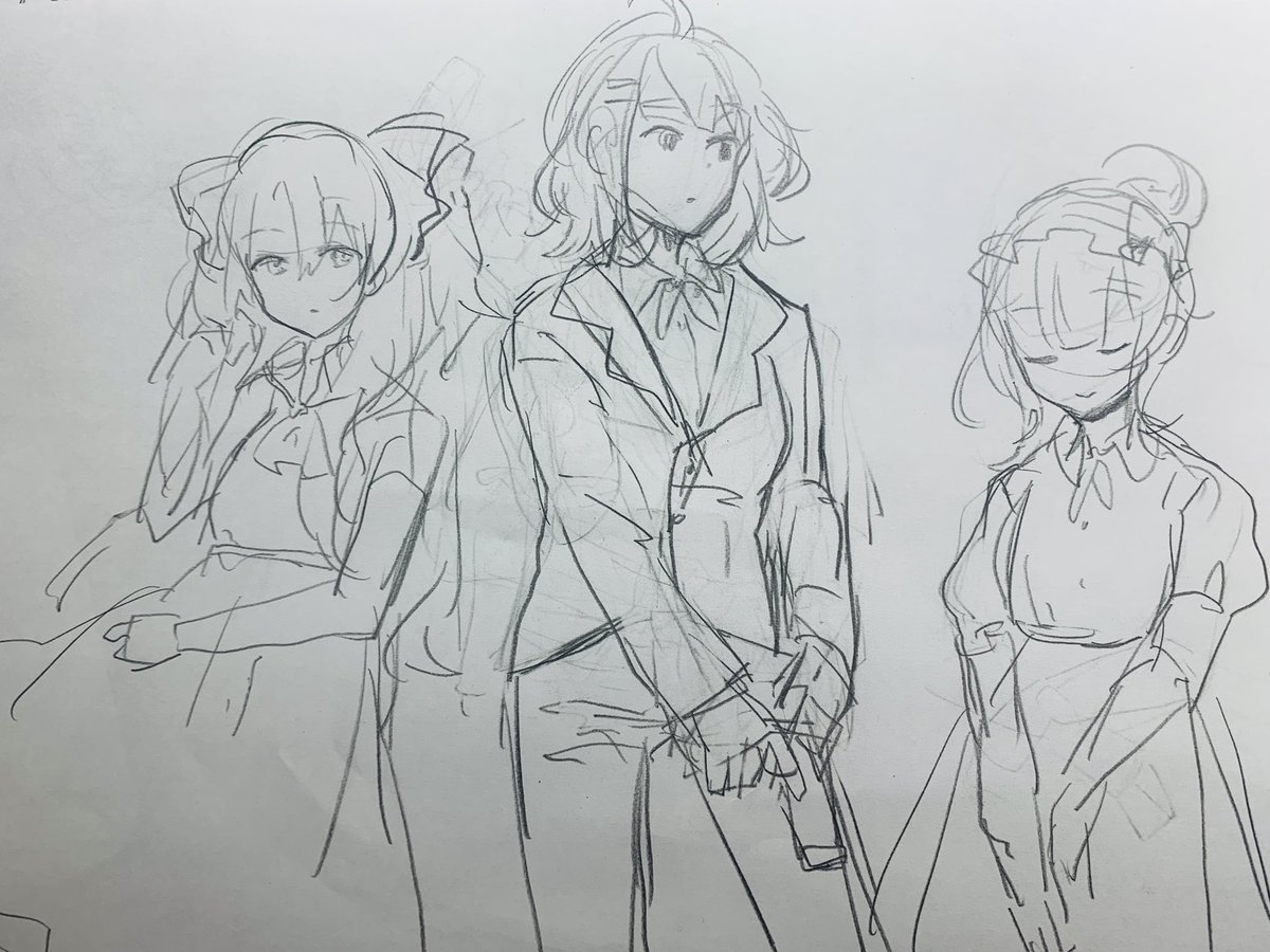病弱ゆにお嬢様、ボディーガードつくちゃん、メイドひまりちゃん妄想の勢い落書き… ゆにお嬢様はお屋敷にめっちゃ本ありそう、つくちゃんめっちゃ強そうだしひまりちゃんはお屋敷にこっそりベボベ部屋作ってそう(通常運転