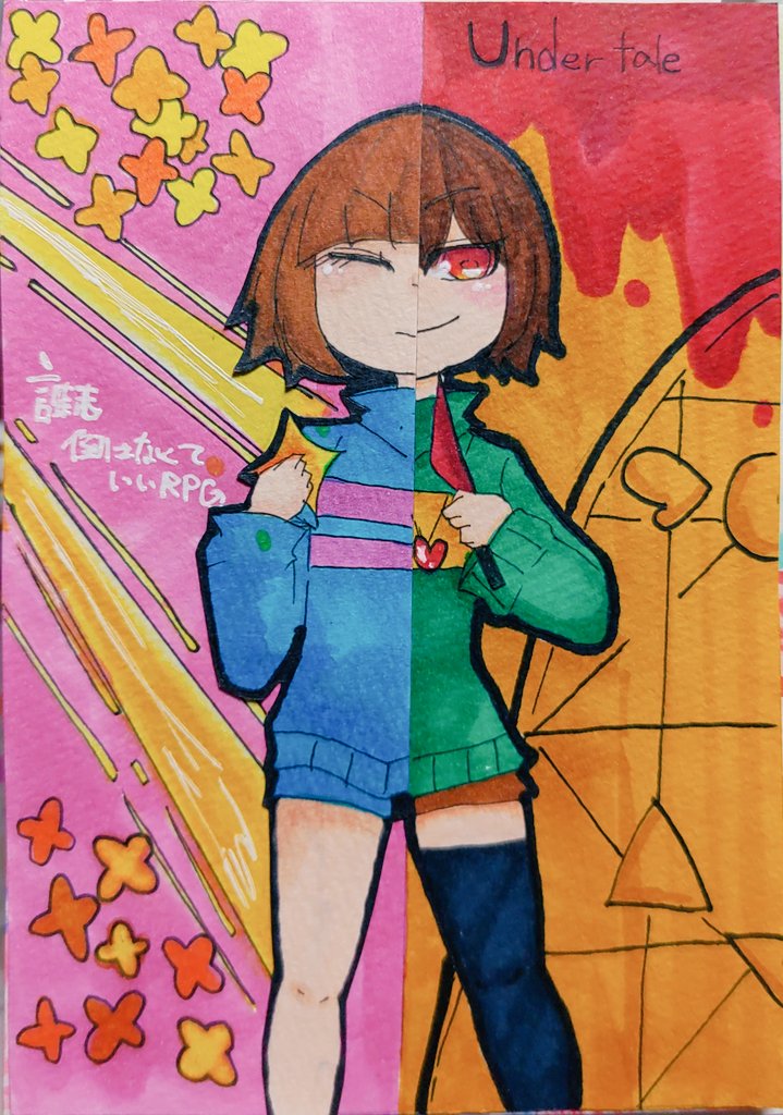 今日のイラストはUndertale!\( •̀ω•́ )/ FriskとCharaを描きました!!!!! 考察動画やAUとか見るの楽しい…!(*´ω`*) 手で反対隠しながら見てね!(`・ω・´) #Undertale #Frisk #Chara #イラスト #アナログ #絵描きさんとつながりたい