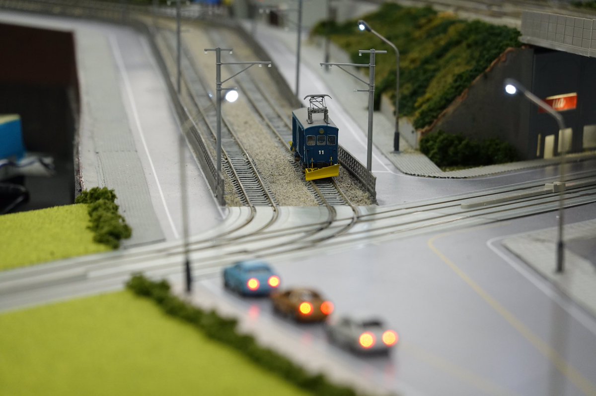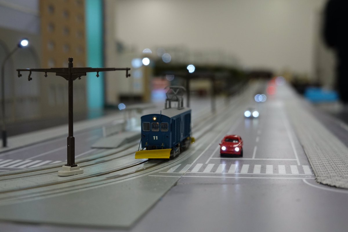 54 116 電飾にも凝っていて、道を走る車はヘッドライトとテールランプが点灯。ゆくゆくは自動でゆっくり暗くなる夜景運転もなんて構想もあるらしく、2期の貨物側線拡張と含め楽しみです 19/01/21 01:15
