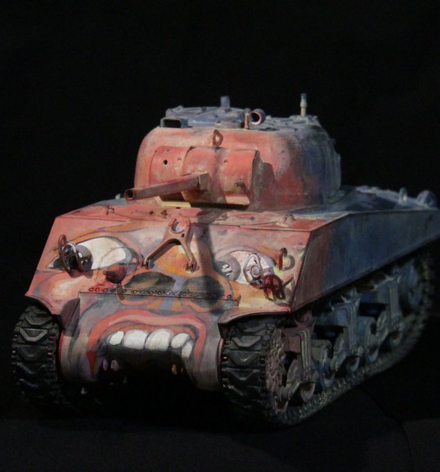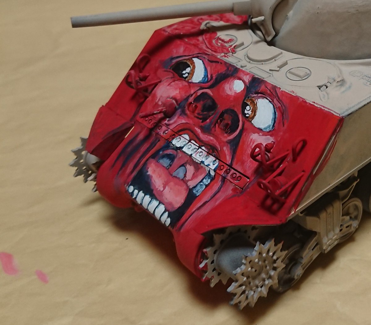 がんばって間に合わせました! BGMはもちろん梅沢富美男さんの「夢芝居」! この顔を見ろ! 俺の歌を聴け! 見よう見まねで汚してたら収拾つかなくなったので写真でごまかしました…… #シャーマン怖い顔選手権