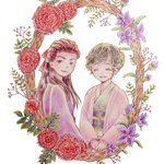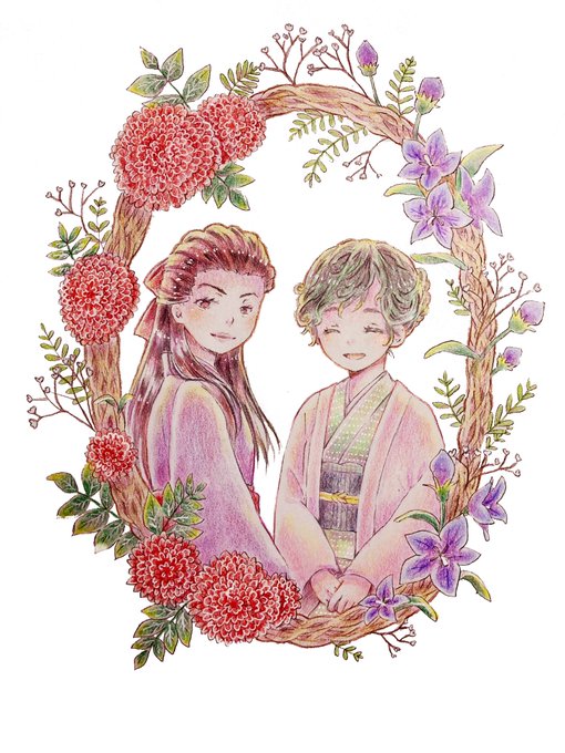 #金カムアナログイラスト部 第3回「花とキャラ」 安定の遅刻参加で失礼します🙏 カエコさんとイゴちゃんを描きました〜この二人の話がもっと見たい カエコさん→ダlリlア(赤) イゴちゃん→キlキlョウ(紫) のつもりで描いてます🌷