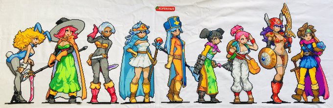 DQ3女遊び人さんを #アイロンビーズ に‼️ シロスさんの元絵↓ twitter.com/shin_shiros/st… やっと9人の旅の仲間が揃いました‼️ 集合写真はスマホを横にしてご覧ください✨ サイズ:縦52cm 横175cm #アイロンビーズ #ドラゴンクエスト #pixelart #SpriteArt