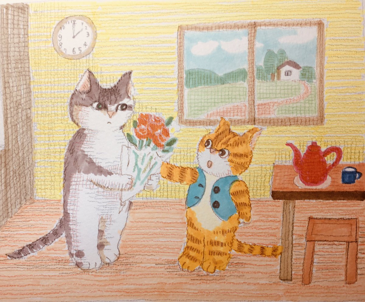 花はきれいだけど、今日は寒い一日。安定しない気分。#drowing #色鉛筆 #コピック #猫と花