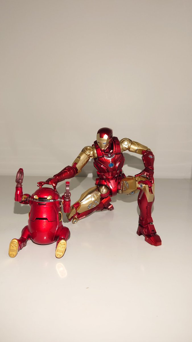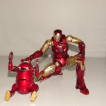 #ファイティングアーマー アイアンマンが届いたので同じ千値練さんの #メカトロウィーゴ めたる君と記念撮影。 いかついデザインで動かなそうなのにとても良く動くからビックリ!