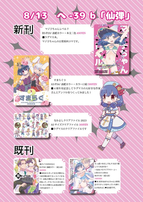 あなたのサークル「仙弾」は、コミックマーケット102で「日曜日 西地区 “へ” ブロック 39b」に配置されました!コミケWebカタログにてサークル情報ページ公開中です! webcatalog.circle.ms/Circle/Map/173… #C102WebCatalog 新刊はラグマスとオリジナルと火山の娘とかで本を出したいです(予定