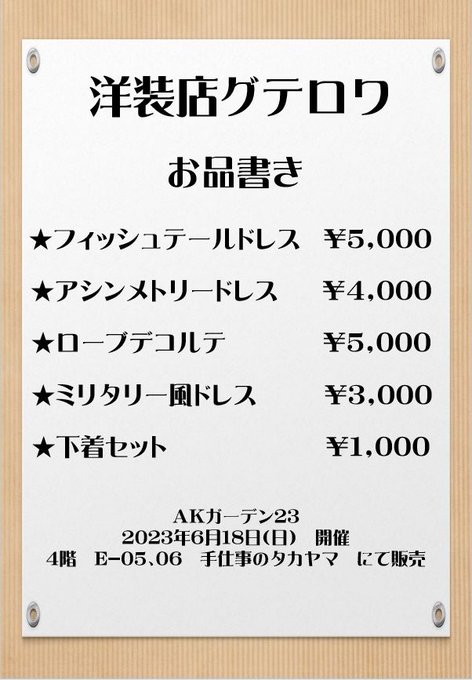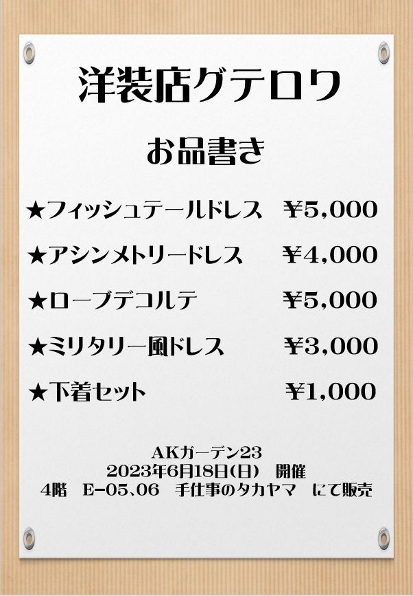14 20 6/18(日) AKガーデン23 「洋装店グテロワ」のお品書きです。新作はフィッシュテールドレス。白、赤、グレーの三色をご用意。 以下のスレッドに他のドレスの画像を投稿します。 #AKG23 #akgarden #メガミデバイス 23/06/16 22:04