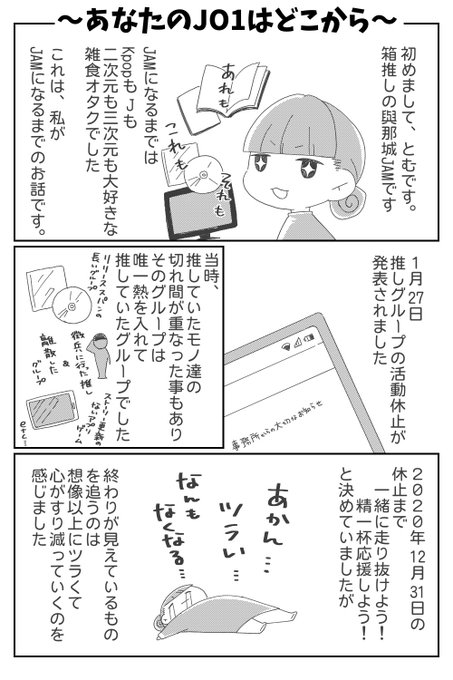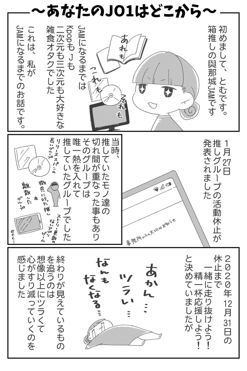 🥳総再生回数2億回突破おめでとう 本当は昨日お祝い記念にUPしようと思ってたのに間に合わなかった… 沼落ちブログ書きたかったけど文章の構成力がなかったので沼落ち漫画にしました、備忘録です リプに続きます #祝_総再生回数2億突破 #あなたのJO1はどこから #JO1fanart