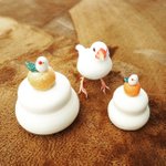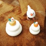 ハチドリのブローチ試作第二弾と、ピアスかボタンになる文鳥さん。 あとは、リアルな文鳥さんのマグカップと、小さいコップは、焼く前のもの🕊✨🔥
