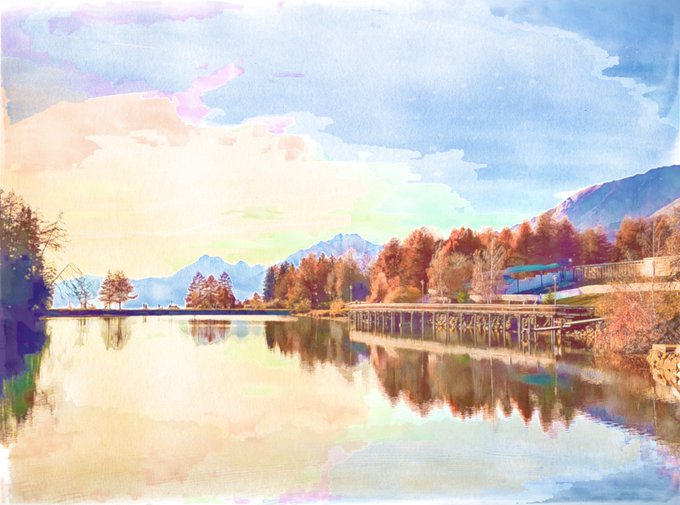 スイス クラン・モンタナ 朝焼けの湖 #art #芸術の輪 #絵描きさんと繋がりたい