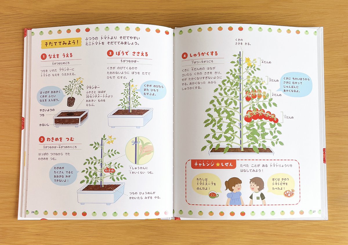 【お仕事】キンダーブックしぜん、7月号でイラストを担当させていただきました。トマトが水玉模様みたいで可愛い表紙です🍅トマトの実がなる枝があのようになっているのを初めて知りました😳 #トマト #イラストレーション #赤