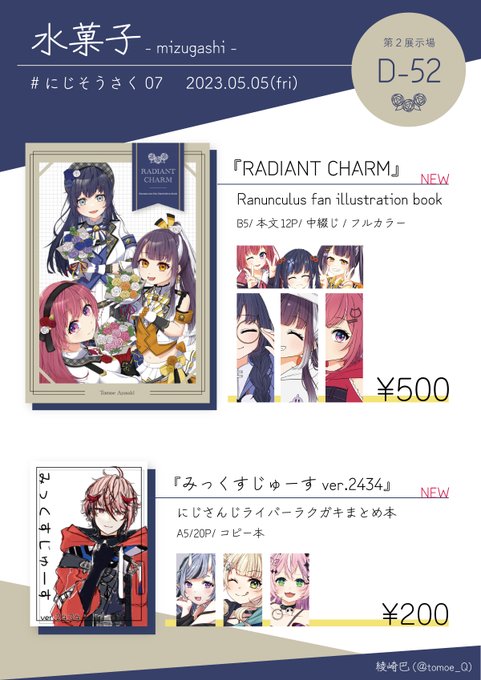 8 17 #にじそうさく07 のお品書きを作成しました! Ranunculusのイラスト本と、いろんなライバーさんのファンアートまとめコピ本を持っていきます。 よろしくお願いします。 23/04/29 22:26