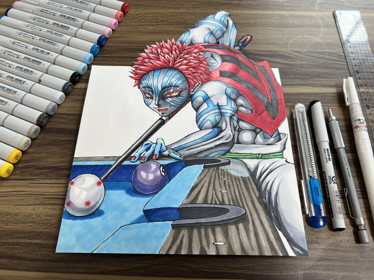 猗窩座×ビリヤード コピックで初めて描いてみました! コピック楽しい! #鬼滅の刃 #鬼滅の刃好きさんと繋がりたい #猗窩座 #イラスト練習中 #イラスト #イラスト好きさんと繋がりたい #お絵描き #お絵描き好きな人と繋がりたい #お絵描き練習中