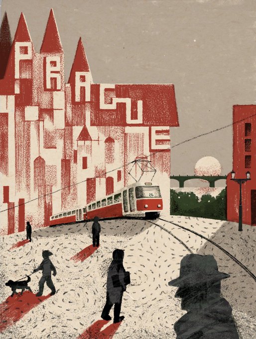 イラスト講座「背景+人」のテーマ。以前訪れたプラハをイメージ。平面的な景色の中でトラムを立体的に、更に動きを出して主役に据えました。 文字の入った建物も気に入っていますが、影の表現と石畳を点線で描いたこだわり部分をタケウマさんに指摘されてフフフ...でした。 #nowakiイラスト #風景画