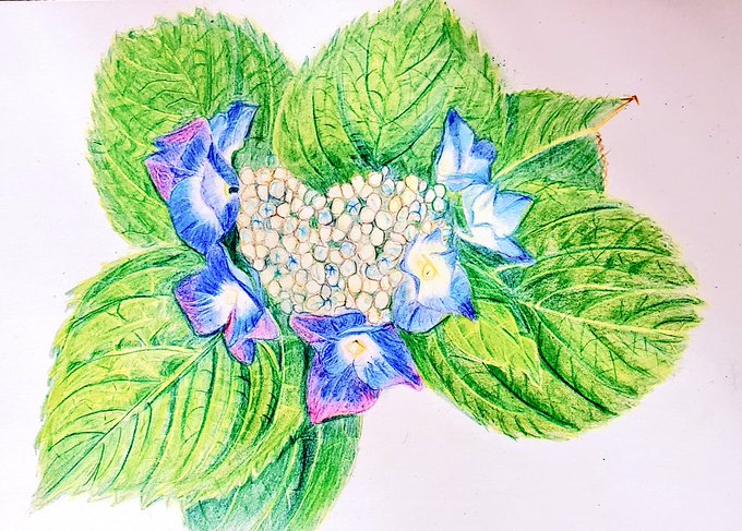 額紫陽花 アジサイ、練習中‼️ 今回は色鉛筆画です 葉っぱは難しいね💦🌿 そして、緑の色鉛筆が減りまくり〜 #新作 #色鉛筆画 #額紫陽花