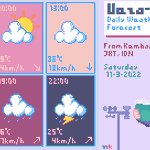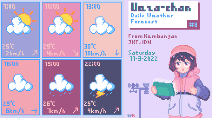 Prediksi Cuaca Ueza-chan #8 Sab, 11-3-2022 Dari Kembangan, Jakarta, Indonesia. Cuaca berawan diprediksi akan terjadi selama seharian penuh. Jangan lupa berolah raga dan penuhi kebutuhan nutrisi~! #illustration #WeatherUpdate #UWF #イラスト #pixelart #T_MR2