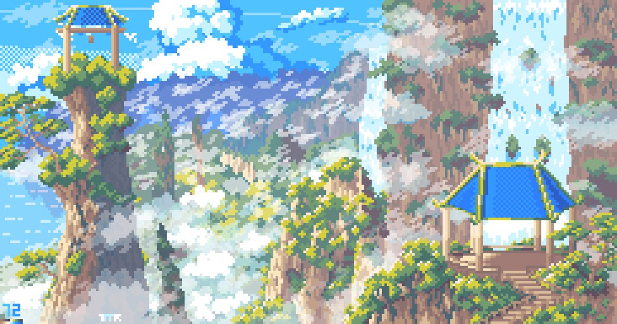 Between Earth and Fairyland Far in region called Dragon Land there's pillar like mountain and cliff, it's say when the cloud of sea appear the gate to fairyland is opened. #illustration #pixelart #イラスト #ドット絵 #scenery #artistontwitter #artidn #landscape #Asia