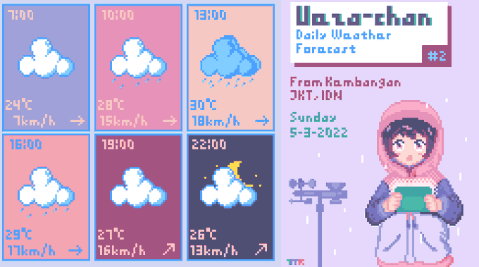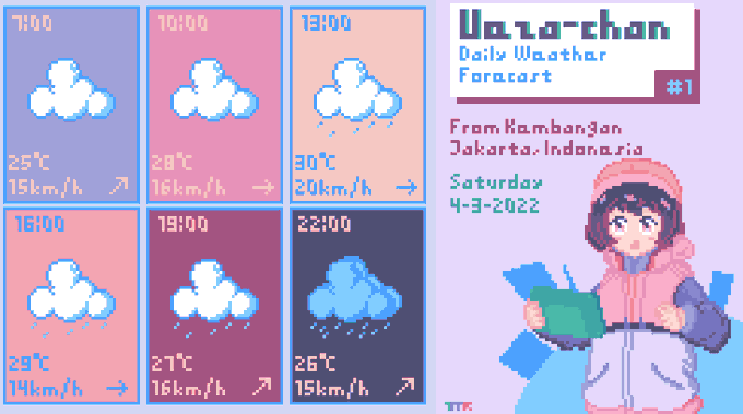 Ueza-chan Weather Forecast #1 Sat, 4-3-2022 From Kembangan, Jakarta, Indonesia. Today will be cool with high precipitation, so don't forget your umbrella and raincoat! Please stay healthy and keep yourself warm~ #illustration #WeatherUpdate #UWF #イラスト #pixelart #T_MR2