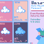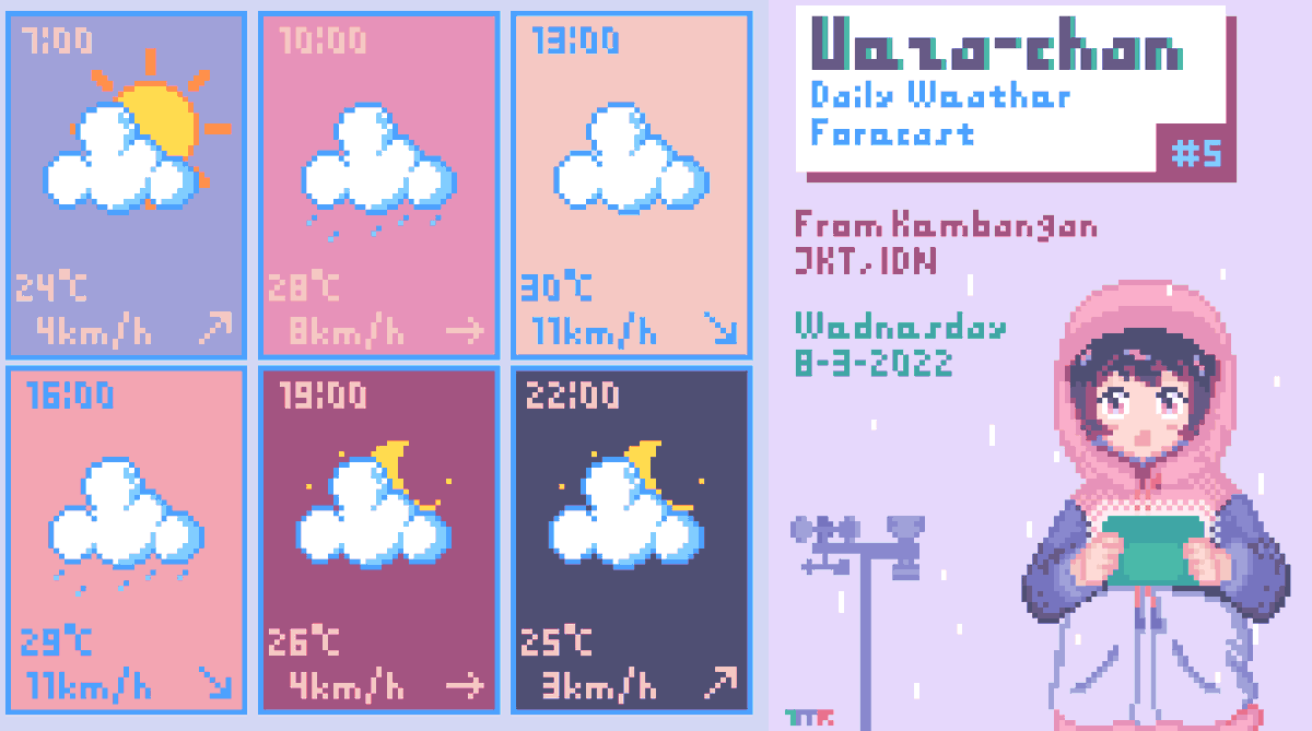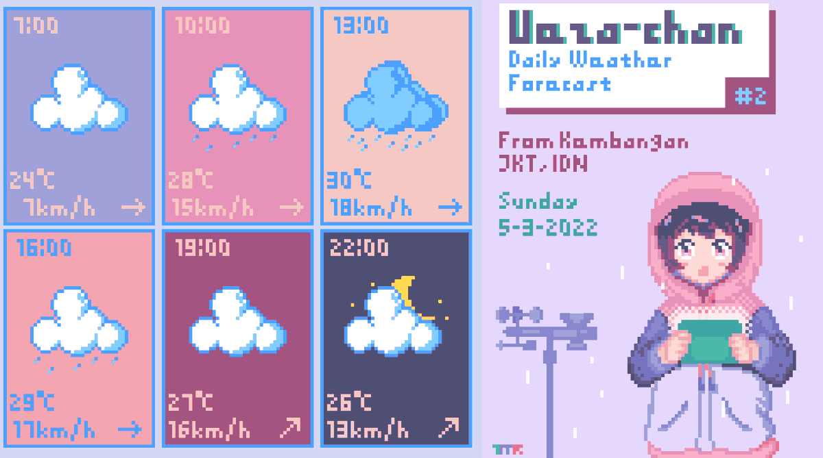 Ramalan Cuaca Ueza-chan #2 Min, 5-3-2022 Dari Kembangan, Jakarta, Indonesia. Siang hari peluang terjadi hujan tinggi dengan suhu harian lebih hangat. Jangan lupa untuk jaga kesehatan selalu~ #illustration #WeatherUpdate #UWF #イラスト #pixelart #T_MR2