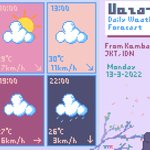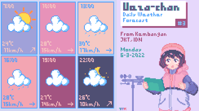 Ramalan Cuaca Ueza-chan #3 Sen, 6-3-2022 Dari Kembangan, Jakarta, Indonesia. Pengendapan air hari ini lebih rendah dan cuaca akan lebih cerah dari hari sebelumnya. Jangan lupa untuk jaga kesehatan selalu~ #illustration #WeatherUpdate #UWF #イラスト #pixelart #T_MR2