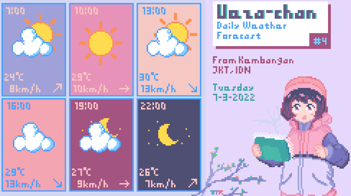 Ramalan Cuaca Ueza-chan #4 Sel, 7-3-2022 Dari Kembangan, Jakarta, Indonesia. Hari ini diprediksi tidak akan turun hujan dengan banyak awan di langit. Jangan lupa untuk jaga kesehatan selalu~ #illustration #WeatherUpdate #UWF #イラスト #pixelart #T_MR2