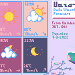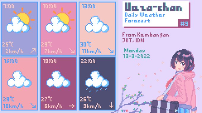 Prediksi Cuaca Ueza-chan #9 Sen, 13-3-2022 Dari Kembangan, Jakarta, Indonesia. Cuaca dari pagi hingga sore nanti akan diprediksi terus berawan. Mulai sekolah di pagi hari dengan semangat meski cuaca terus berawan! #illustration #WeatherUpdate #UWF #イラスト #pixelart #T_MR2