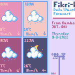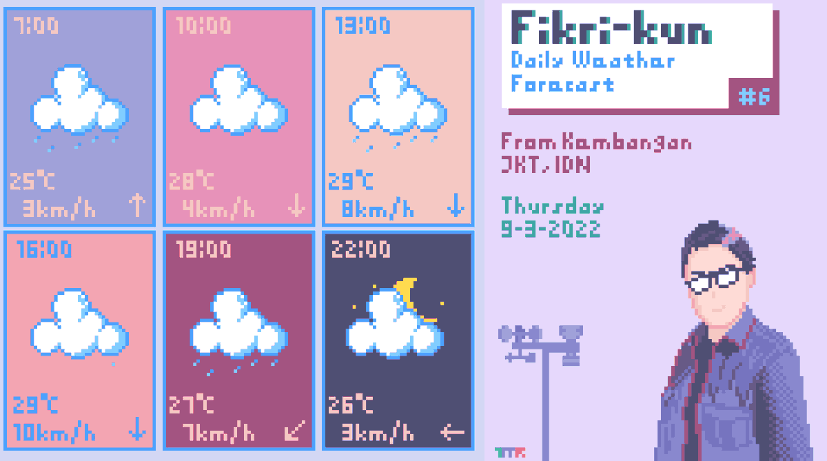 Prediksi Cuaca Fikri-kun #6 Kam, 9-3-2022 Dari Kembangan, Jakarta, Indonesia. Hari ini hujan akan diprediksi lebih sering turun dengan arah angin berubah ke selatan Tetap jaga kesehatan dan tetap produktif! #illustration #WeatherUpdate #UWF #イラスト #pixelart #T_MR2