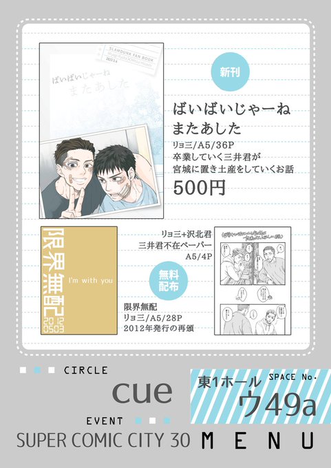 【5/4 SUPERCOMICCITY30-DAY2-】 東1ホール・ウ49a「cue」SDリョ三 ▼新刊の中身 pixiv.net/artworks/10730… ▼🐅通頒(イベント後追納予定) ecs.toranoana.jp/joshi/ec/item/… 5/3の23時頃までサークル参加の方(売り子さん・他ジャンル含)を対象に取り置き中です。 triokini.com/circle/item/14…