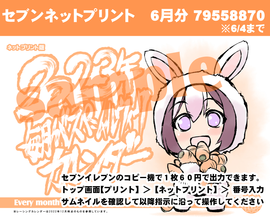 『スぺちゃんカレンダー2023』6月分をセブンネットプリントに登録しました。 ・79558870 ※~6/4迄 6月はスペちゃんとミークで。 サンプル画みたいな雰囲気のイラストを添えたカレンダーです。(出力前に画像確認可) 毎月、月またぎ辺りを目処に登録する予定ですのでよろしくお願い致します。