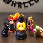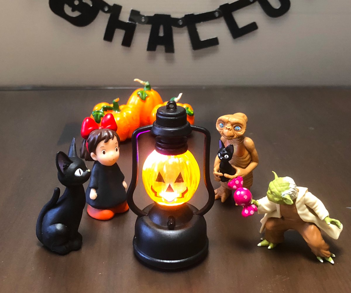 本日 #ハロウィン なので部屋飾りは手作り蜘蛛の巣と、 マスコットさん達が黒猫やキャンディーを持ってムード作り。 ミニミニおばけランタンは実際にライトが点滅します♪ ETにカボチャを乗せると帽子みたいで可愛い😙 #オモ写