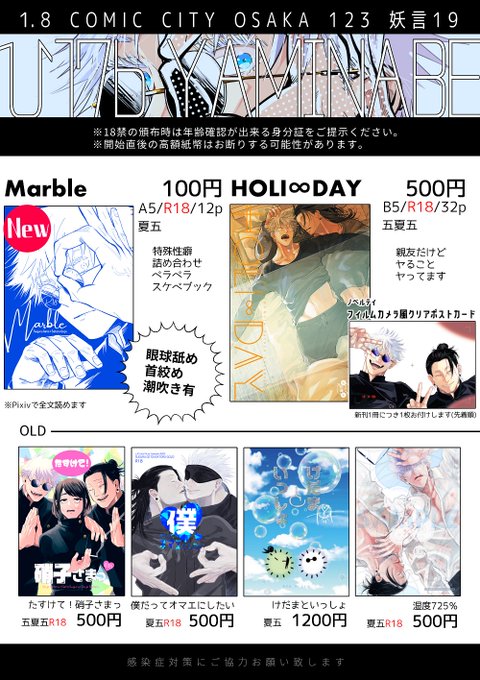 8/21 超妖言2022夏 6号館B ふ20a YAMINABEのおしながきです📛 ※一部リバ作品の取り扱いがあるため、あらかじめCP表記をご確認ください※ 新刊サンプル→ pixiv.net/artworks/10062… 九重さん(@coconoel)の既刊も委託しております! 改めまして、明日はよろしくお願いします〜💙
