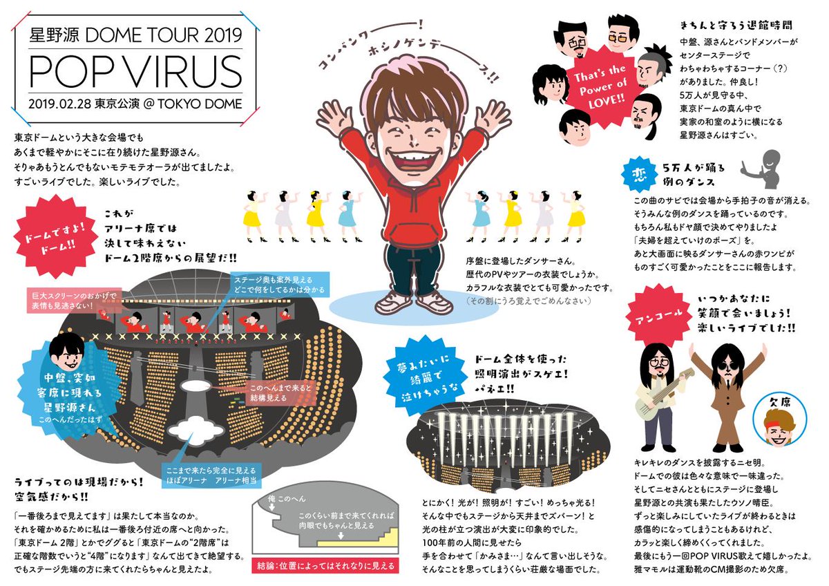 66 406 福岡公演終わったようなので。ネタバレ含むので寝かせといた星野源東京ドームめっちゃ楽しかったよイラストです。星野源東京ドームめっちゃ楽しかったよ。ツアーおつかれさまでした。 #POPVIRUS 19/03/10 22:01