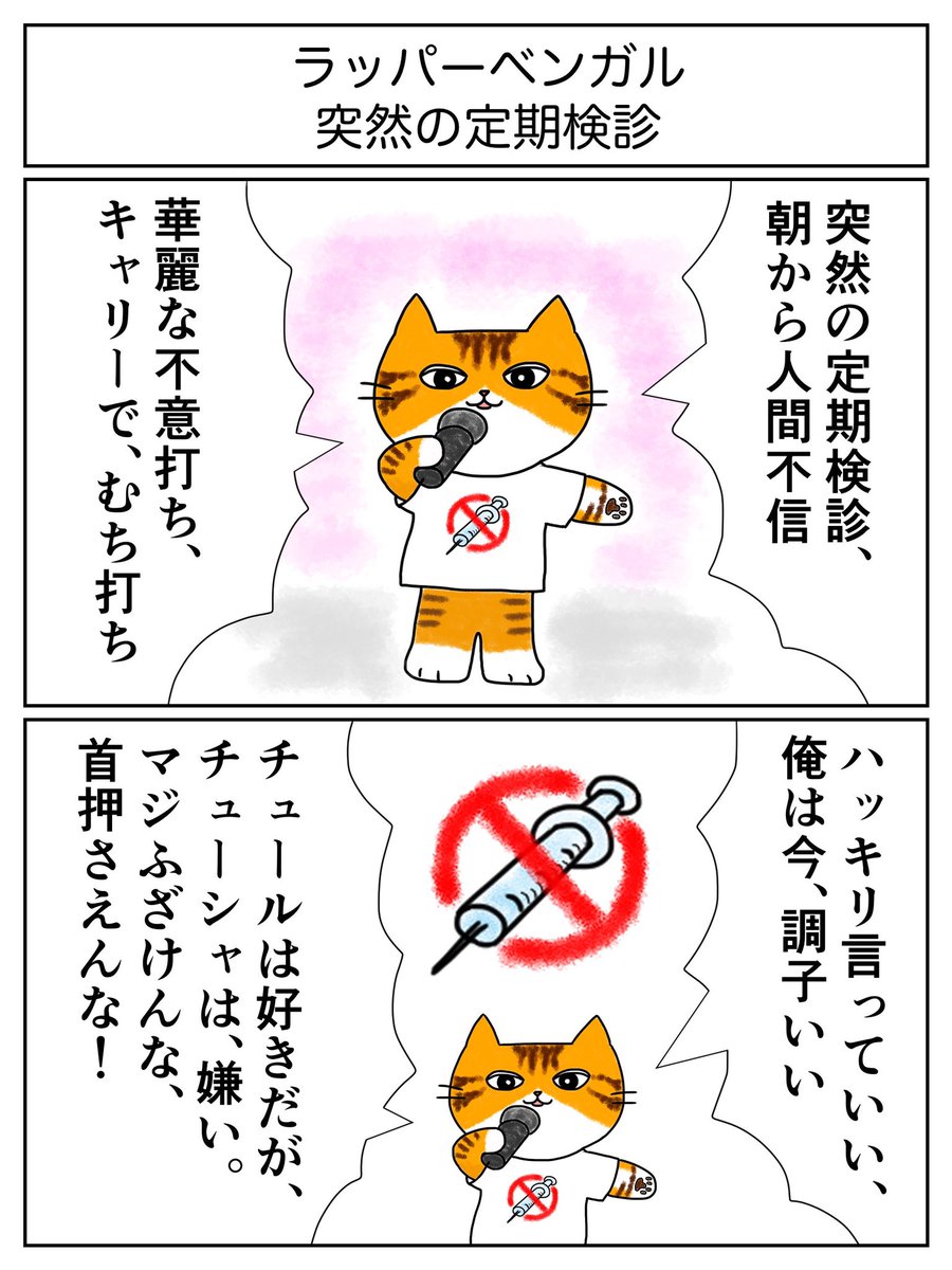 1 2 ラッパーベンガル 魂の叫びシリーズ 「突然の定期検診」 #漫画が読めるハッシュタグ #4コマ漫画 #2コマ漫画 #猫 23/03/31 21:01
