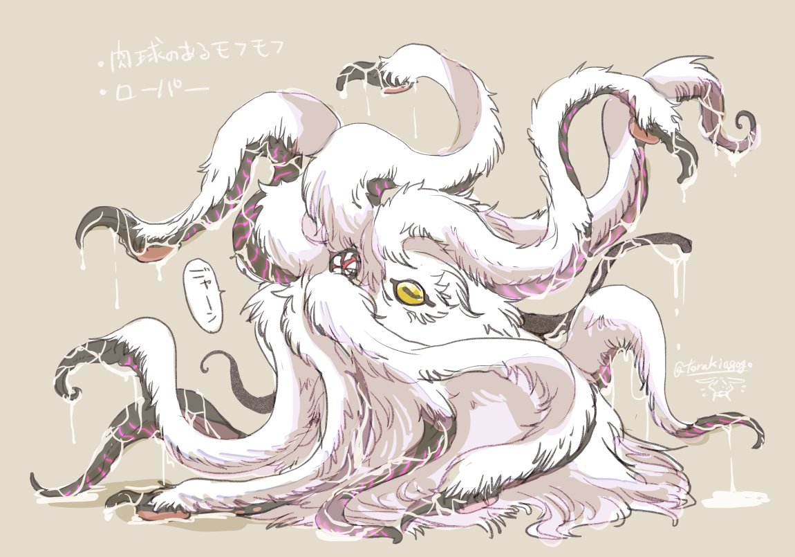 #人外版深夜の真剣お絵描き60分一本勝負 「ほらみて!愛されローパーだよ!肉球付きのモフモフだよ!!」 「愛され…?」 生臭いモフモフのローパーだよ。爪っぽいのは見た目に反して柔らかだよ。触手だからね。 ・アナタが考える肉球があるモフモフの人外 ・ローパー した。