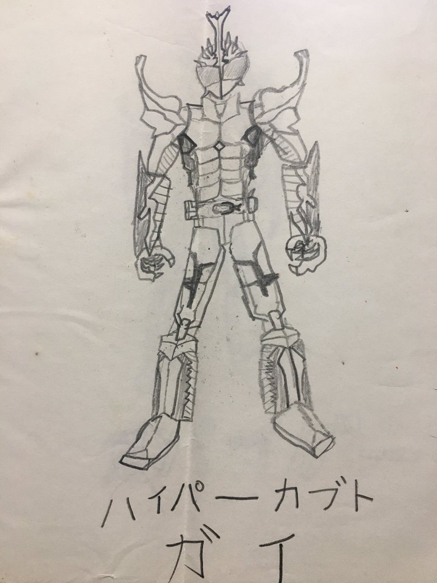 #ライダー計画if #仮面ライダーカブト #オリジナルライダー #過去絵リメイク #これがこうなってこう 1枚目(当時小学生 2枚目下書き(描き直し) 3枚目完成 4枚目エフェクト追加 少年時代の虎丸君よ… これが見たかったんだろ…待たせたな!