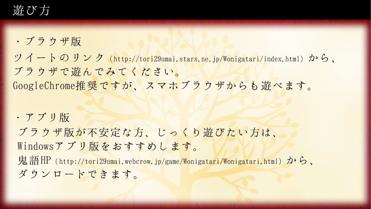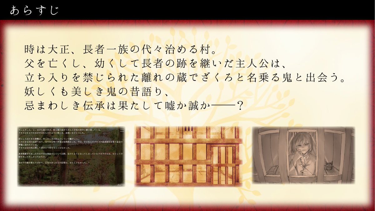 地味にバズったので自創作宣伝!!! 大正因習伝奇ノベル『鬼語(ヲニガタリ)』フリー公開中!!! 座敷牢に囚われた『鬼』がカタる物語とはーー? tori29umai.stars.ne.jp/game/Wonigatar… 因習村の座敷牢に囚われたふたなりヒロインといちゃいちゃ(愛憎)するノベルゲームです。