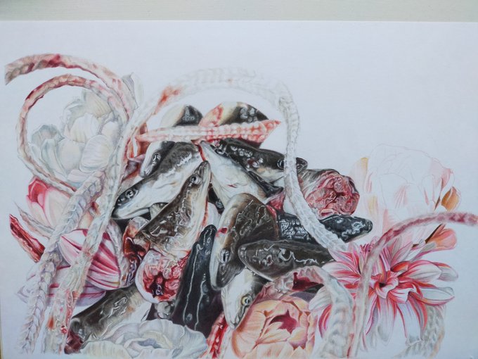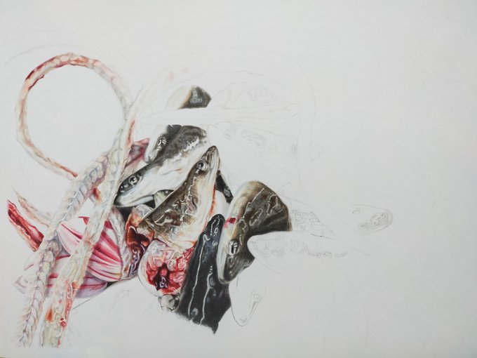 〜進捗〜 雨の一日 難…!! どんな風になるんだろ 偏頭痛ぽくなってきた #色鉛筆画 #アナログ画 #うなぎの絵 #魚の絵 #グロいですね