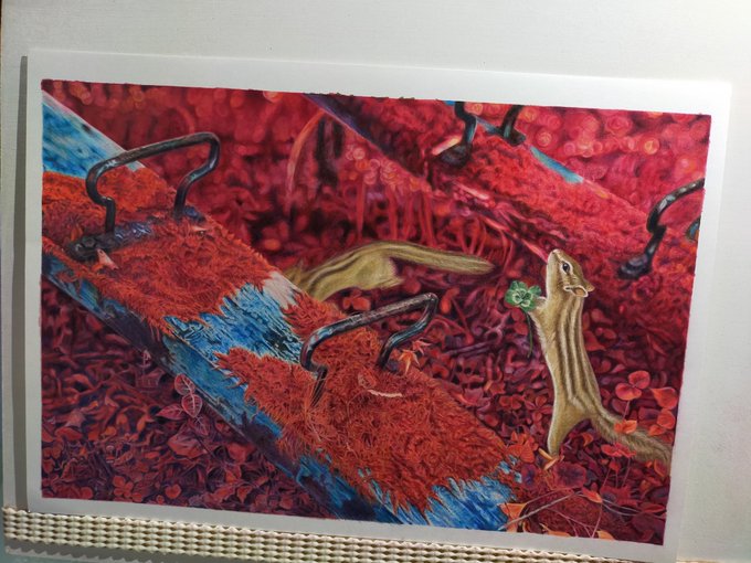 2022.1.10《色鉛筆画》 9月から何とか時間を作りつつやっと完成! #色鉛筆赤 #赤の世界 #リスの願い #写真がうまく撮れません