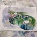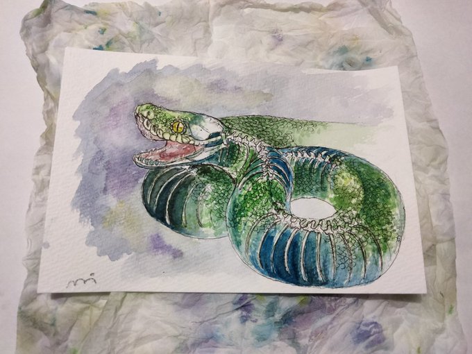 1 5 #100日チャレンジ グリーンパイソン 052 #水彩画 #イラスト #ヘビ #骨 #爬虫類 23/03/11 21:20
