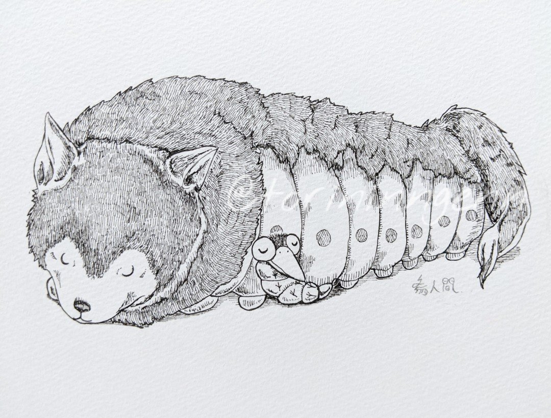 オオカミムシさんとトリムシさん。仲良くお休み中。 #ペン画 #イラスト #クリーチャー #illustration #drawing