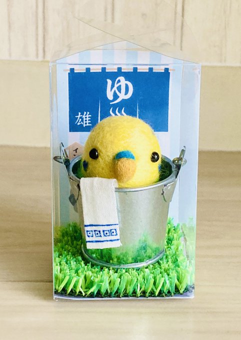 2 16 セキセイインコを温泉に入れてみました🐣♨️ 男女別の露天風呂です🧖♂️🧖♀️手拭いは頭にかぶせても可愛いですよ💕 #セキセイインコ #羊毛フェルト #デザフェス55 22/04/12 11:53