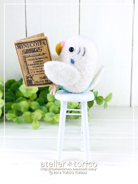 椅子に座って雑誌を読む賢いセキセイインコさん #セキセイインコ #白ハルクイン #羊毛フェルト