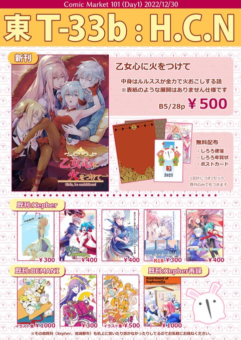 24 25 C101おしながきです。新刊なんとかご用意できそうです…!1日目東T-33b「H.C.N」にてお待ちしております。 22/12/29 05:44