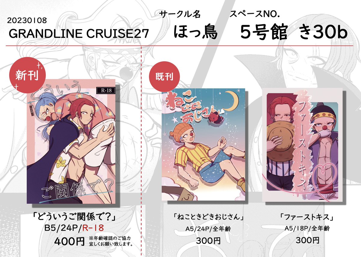 5 11 ⛄️インテお品書き⛄️ 無配ポストカードもあります!よろしくお願いします!! pixiv.net/artworks/10422… 23/01/04 12:29