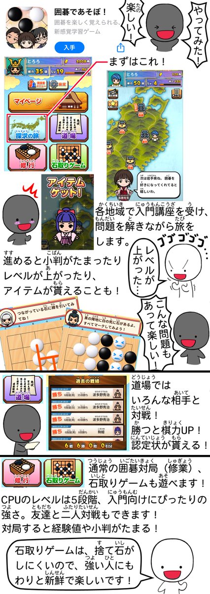 こちらのアプリ、すごく面白いので碁石さんでレビューっぽいのを描いてみました!(全2枚)。 入門向けで広告のない無料アプリなので(すごい)、囲碁始めてみようかな、という方は是非遊んでみてください!😄 僕も昨日からこればかりやっています(ミッション全部達成したい😇) #囲碁であそぼ #囲碁 twitter.com/Nihonkiin_pr/s…