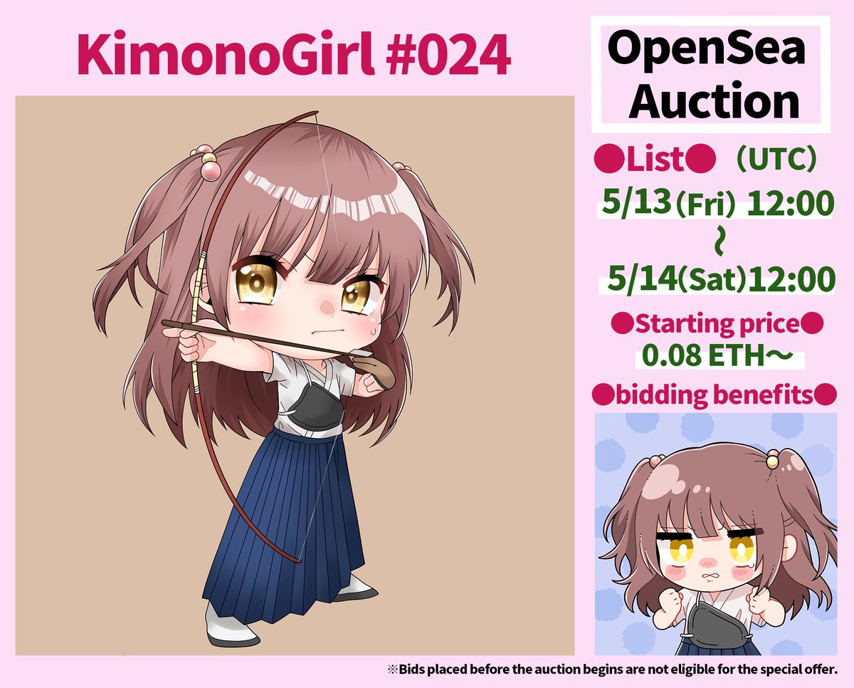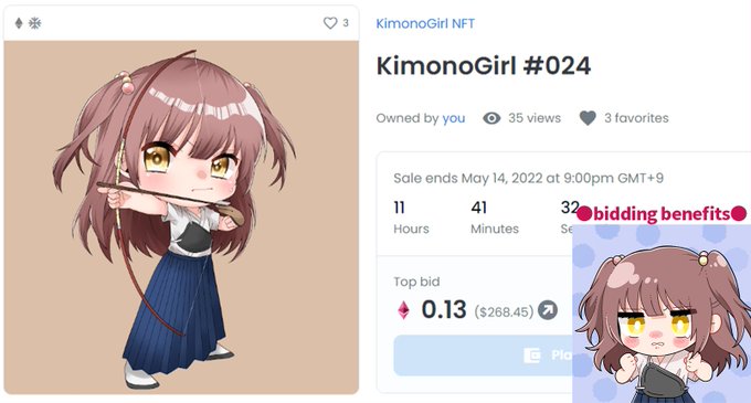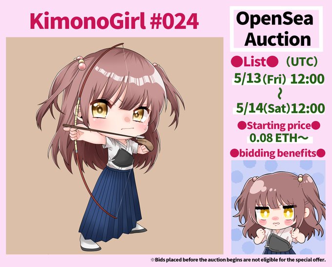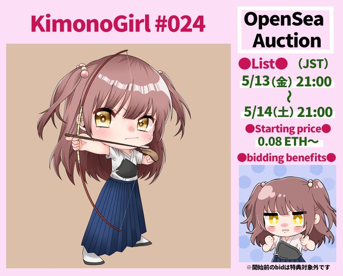 gmです☀️ 昨日からスタートした KimonoGirl #024 弓道ちゃん のオークションは、開始早々から入札いただき、現在 0.13ETHです🎉 本当にありがとうございます🥰🙏 本日(5/14)21時に終了となりますので、よろしくお願いします🙇♂️✨ opensea.io/assets/0x495f9… #NFTs #NFTartist #NFTCommunity #JPNNFT