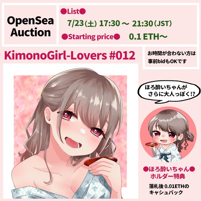 🎊新作 Mint🎊 KimonoGirl-Lovers #012👘 【オークション】 ✅7/23(土)17:30 ~ 21:30(JST) ※4時間のみ ✅0.1 ETHスタート ✅opensea.io/assets/ethereu… 「一緒に飲もうよ❤️」とお誘いするほろ酔いちゃんをよろしくお願いします #NFTs #NFTartist #NFTCommunity #JPNNFT
