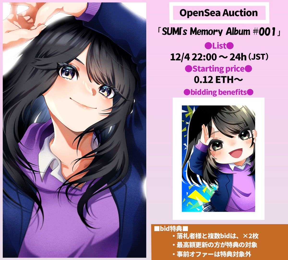 💖New Release💖 新コレクション「SUMI's Memory Album」 オリキャラのスミちゃん💖 いっぱい想いを込めて描きました! よろしくお願いします✨ ✅12/4(日)22:00~ 24h Auction ✅0.12ETH~ ✅bid特典あり(ちびスミちゃん) 作品URL🔽 opensea.io/assets/ethereu… #newnnf